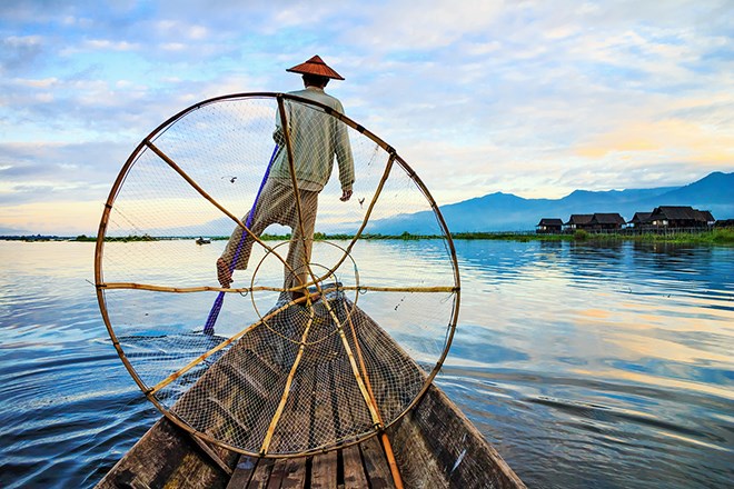 Visitors from all over the world travel to Bagan to witness dawn and dusk settle in over the pagodas. These legendary sunrises and sets can be observed throughout Myanmar, and one of the most unique places to see them is from Inle Lake. Wooden bungalows, some available for rent, sit atop the fresh water, alongside floating gardens and Intha fisherman who row canoes in the most distinctive form: standing on one leg.
