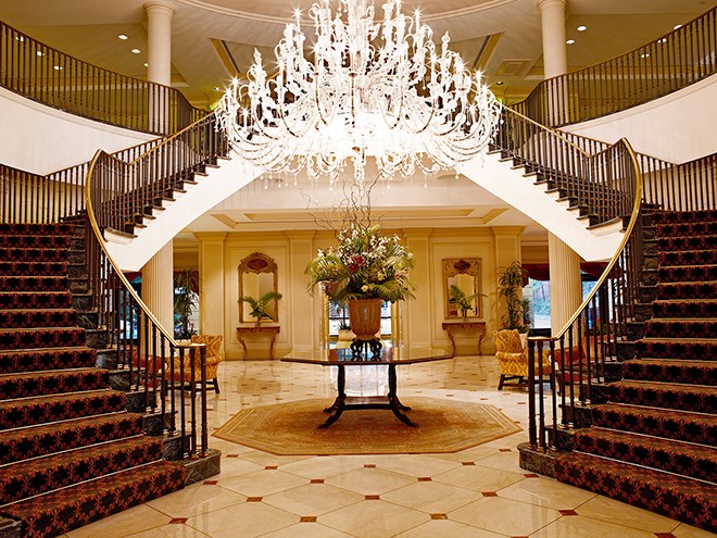 The lobby welcomes guests with a grand staircase and Murano glass chandelier. So, yeah: You know things are going to be good.