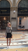 Catholic cathedrals and basilicas throughout Italy and Vatican City enforce a strict dress code for all visitors. On my last trip to Milan, I was denied entry to the Duomo because my skirt, pictured to the right, was too short. (Prada's flagship store, however, did not object to my fashion choices.) To avoid being turned away from houses of worship, wear clothing that covers the shoulders and skirts and dresses that go past the knee and cover midriffs. Jeans are allowed. Summer visitors should carry a shawl to cover sleeveless tops.