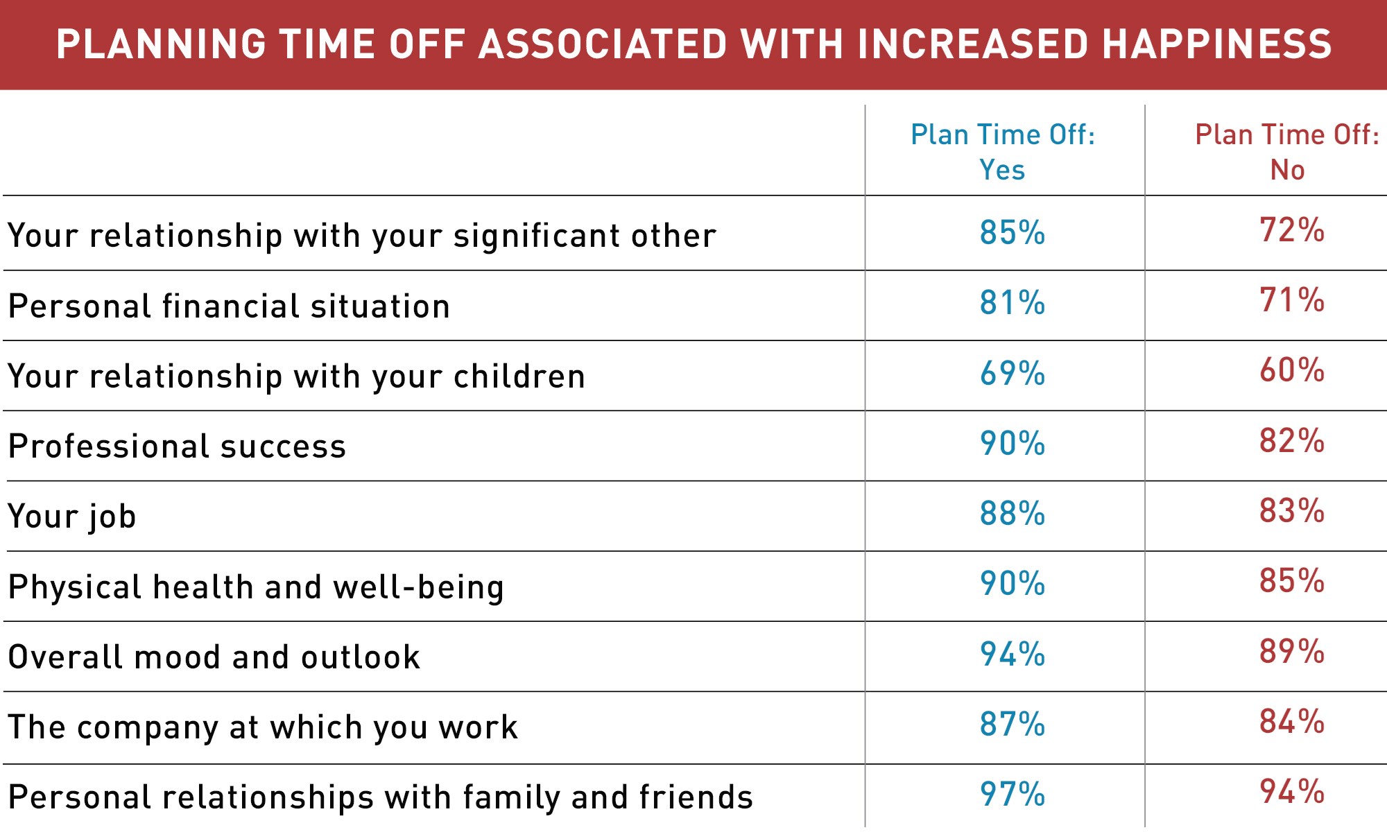 It’s statistically proven that time spent planning vacation directly correlates with greater happiness in your personal and professional lives, as depicted in the chart below.