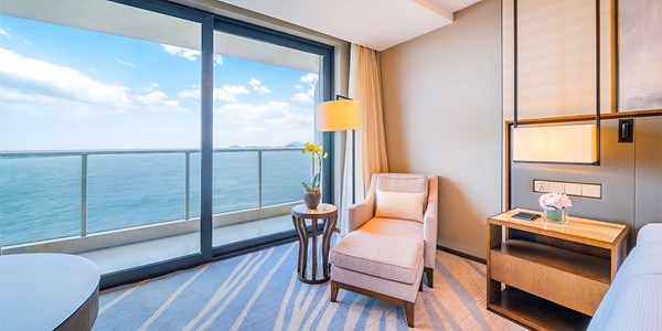 舟山绿城直营朱家尖东沙度假酒店,紧邻朱家尖天然海湾,依山傍水、枕海而居,入住 180° 度海景大床房,或适合家庭出游的 90° 海景家庭房,皆有 48 m² 宽敞空间 、无死角海景 、超大海景阳台,宅在房间内就能听潮观海,住宿体验佳!