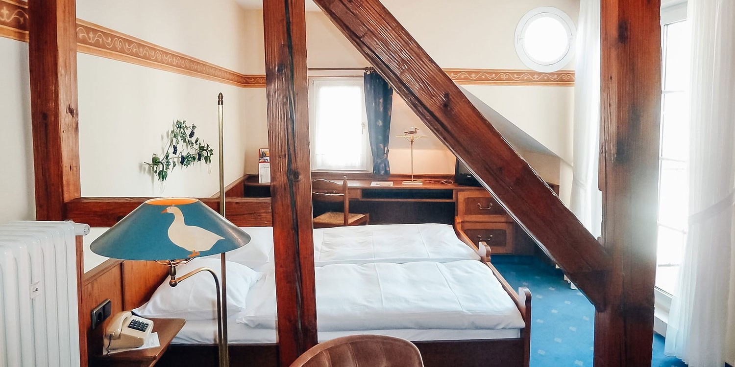 Teilweise mit Deckenbalken: Sie schlafen im 25 m² großen Komfort-Doppelzimmer.