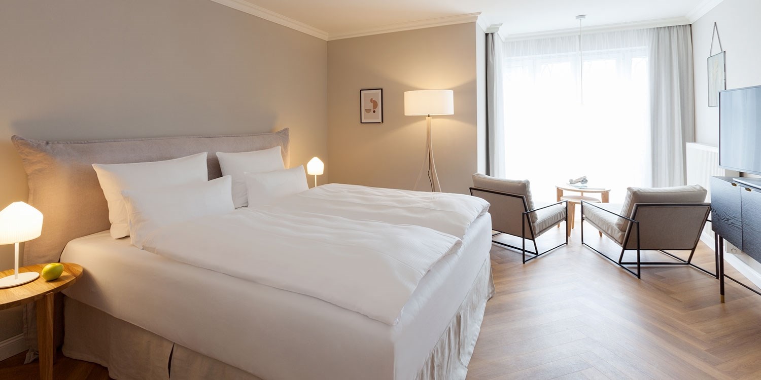 Sie übernachten auf 28 m² im Vju-Doppelzimmer mit Kingsize-Bett.
