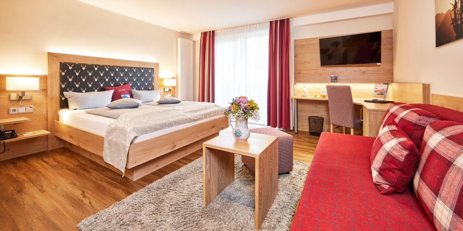 Helle Holzmöbel, Hirsch- und Blumenmotive, karierte Stoffe: Ihr Komfort-Doppelzimmer ist bis zu 30 m² groß und alpin eingerichtet.