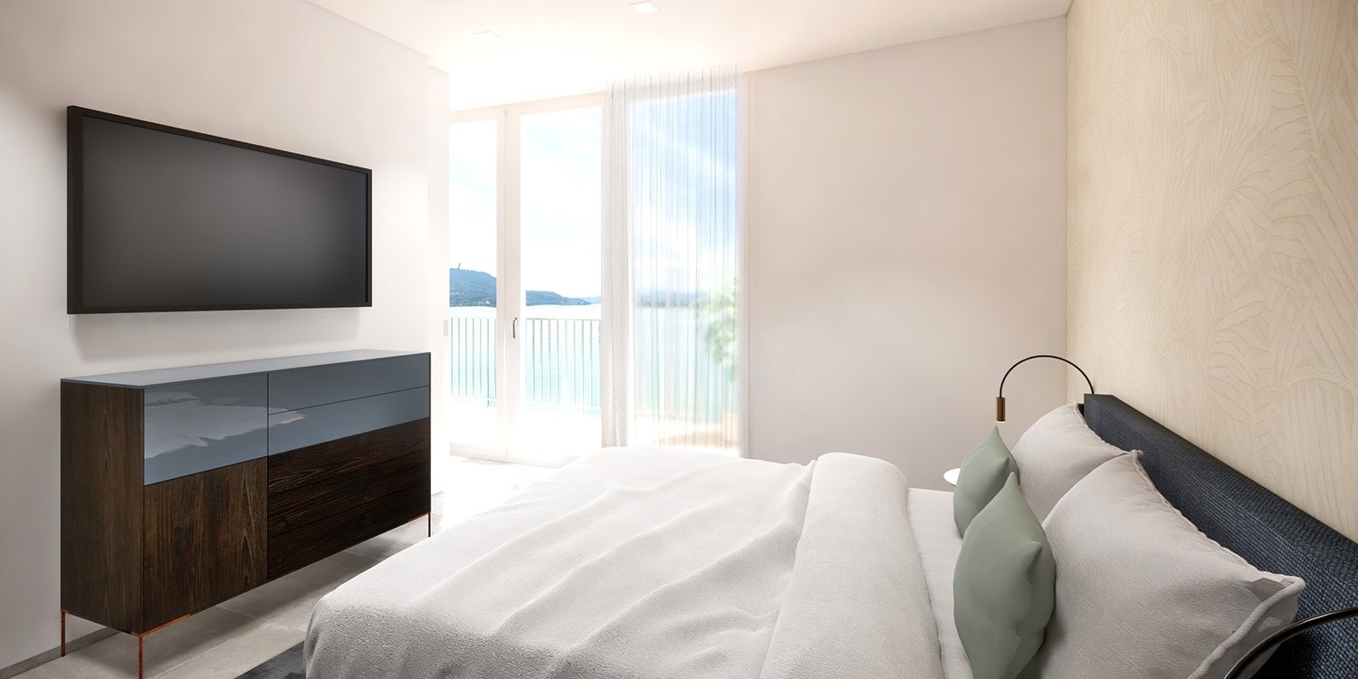 Traumhafter Blick auf den Wörthersee vom Balkon oder aus den drei verglasten Wänden des Wohn-Ess-zimmers und des Schlafzimmers. Suite sehr geräumig mit Küchenzeile, Ankleideraum und zusätzlichen halbhohen Schränken , also auch viel Stauraum. Aufzug zum Steg mit zahlreichen Liegen und