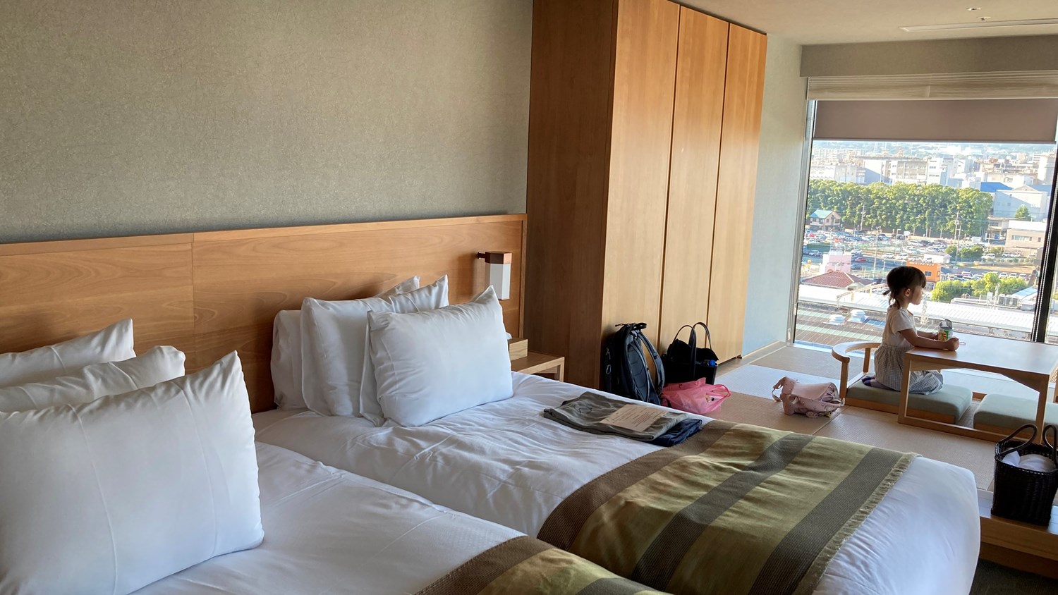 駅前という利便性もさることながら、「富士を感じるベースホテル」というコンセプトの通り、客室や大浴場ではゆったり寛ぎながら美しい富士山を眺める贅沢な時間を堪能できます。今回宿泊したのはデラックスコーナー和洋ツイン。広々としたベッドスペースの奥に2面採られた大きな窓がある小上がりの畳スペースがあり、子ども連れでものびのび寛ぐことができました。