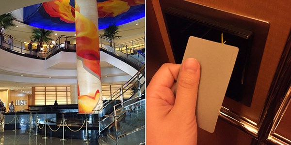 フロント前に行列が! 実はこれ、14:00~のチェックインを待ちに待った人たちの行列なんです。これに並ばなければならないのか…と思っていたら、行列の後ろの立て看板に「クラブフロア宿泊の方はスタッフにお申し付けください」の案内が。意を決して声をかけてみると、爽やかな笑顔とともに「ご案内致します」の一声でエレベーターへ案内された。そこはかとない優越感に心を躍らせながら進んでいく…