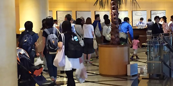 帰る際にロビー階に降りると、ロビーをぐるっと囲むような行列が! 朝食ブッフェの列と思いきやなんとチェックアウト待ちの行列…。すでに専用カウンターでチェックアウトを済ませた私たちは、行列に並ぶことなくすぐにみなとみらい観光に繰り出すことができました。時は金なり、時間を有効に使えるのもクラブフロアの特権ですね。皆さんもぜひ一度、体験してみてはいかが?