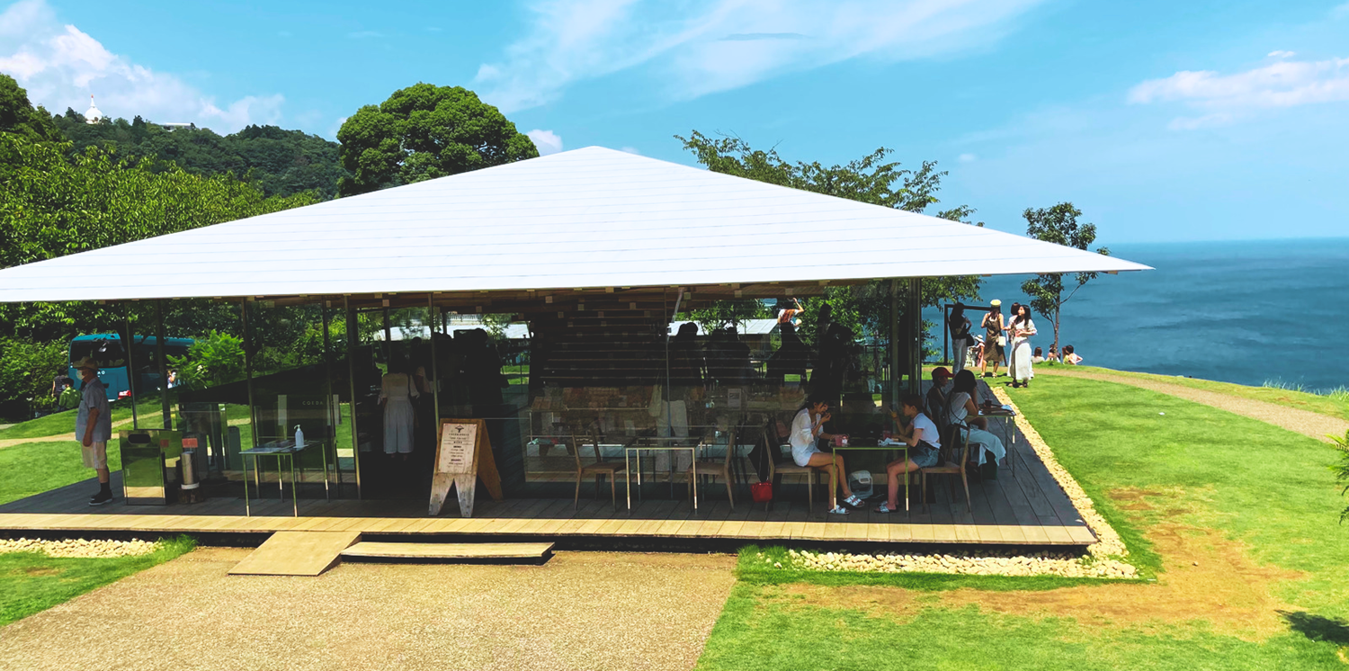 熱海駅周辺から離れて訪ねたのは、以前「アカオハーブ&ローズガーデン」として知られた、バラやハーブが咲き誇る20万坪のガーデン。昨年リブランドされて「ACAO FOREST」となりました。ガーデンのなかでも丘の上の見渡しの良い場所にあるカフェ「COEDA HOUSE」は、国立競技場と同じく隈研吾氏が設計した一本の大きな木を模した、木組みのデザインが特徴的なデザインです。カフェからは相模湾や空が広がる絶景を眺めることができ、開放感が抜群でした。建物のデザインに合わせ、メニューにはバームクーヘンなど“木”をイメージしたものや、バラやハーブを使ったカラフルなドリンクもありました。「ACAO FOREST」には今年の4月「herb house & 薔薇堂」という、ベーカリー「薔薇堂(そうびどう)」、揚げたてのドーナッツの店「DONUT ROOM」やセレクトショップが入った商業施設もできており、土産選びにぴったりです。