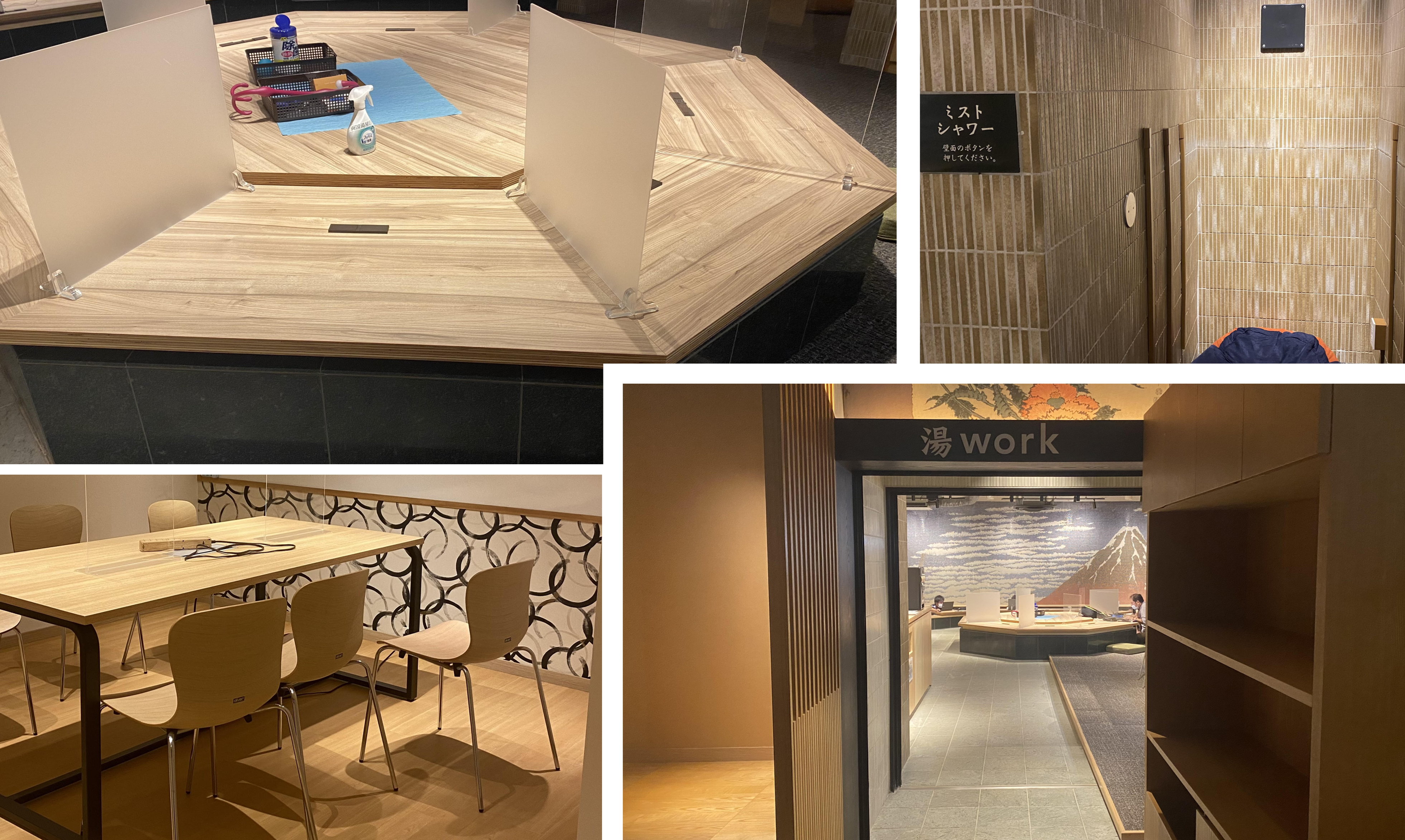 施設内にある「湯Work」と言うワークスペースにも注目を。デザイン性と機能性を兼ね備えているところが素晴らしいのです。湯船の形そのままにテーブル席が作られていたり、サウナとして利用されていた部屋を明るい会議室にしていたりと、温浴施設ならではの特徴はそのままに快適に仕事ができる環境が整えられているのは「お見事」の一言。一番衝撃的だったのは、「ミストシャワー」と書かれた個人スペース!思わずボタンを押すとどこからかシャワーが出てくるのではと勘違いしてしまいそうでした。