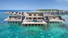 From above, the sloping silver roofs of the overwater bungalows resemble manta rays gliding in the water.